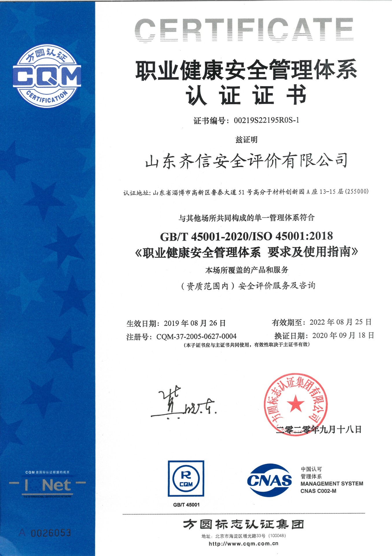 職業健康安全管理體系認證證書